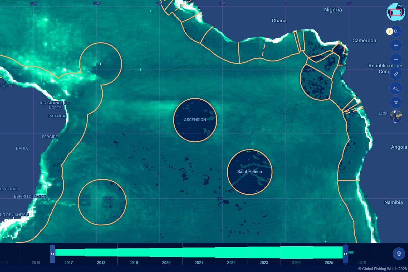 When they leave the MPA, Ascension’s juvenile seabird use areas of high seas fishing effort. By combining datasets on seabird movements and apparent fishing effort, we can better understand the potential ecosystem-level impacts of fishing in remote tropical oceanic habitats. Areas of overlap could also help inform strategies to target satellite surveillance for Illegal, Unreported and Unregulated fishing inside the MPA.