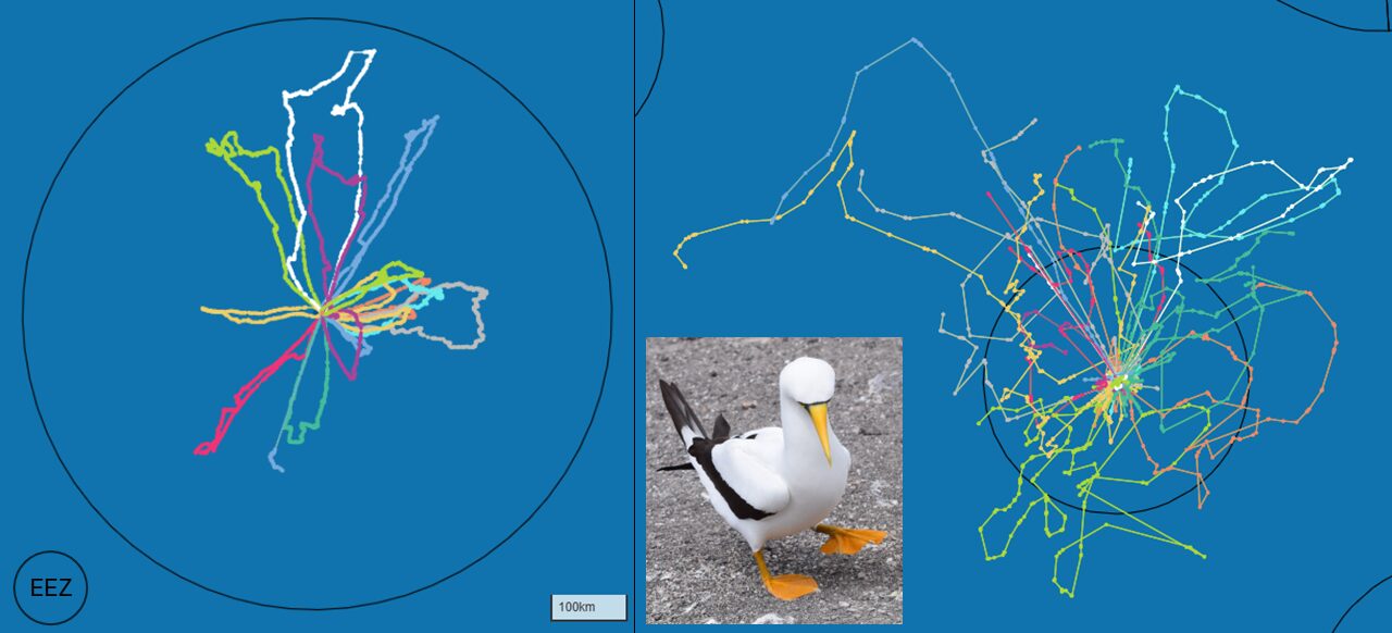 Left = tracks for breeding adult Masked Boobies from a previous study. Right = tracks for juvenile Masked Boobies from this study. Black = Exclusive Economic Zones.