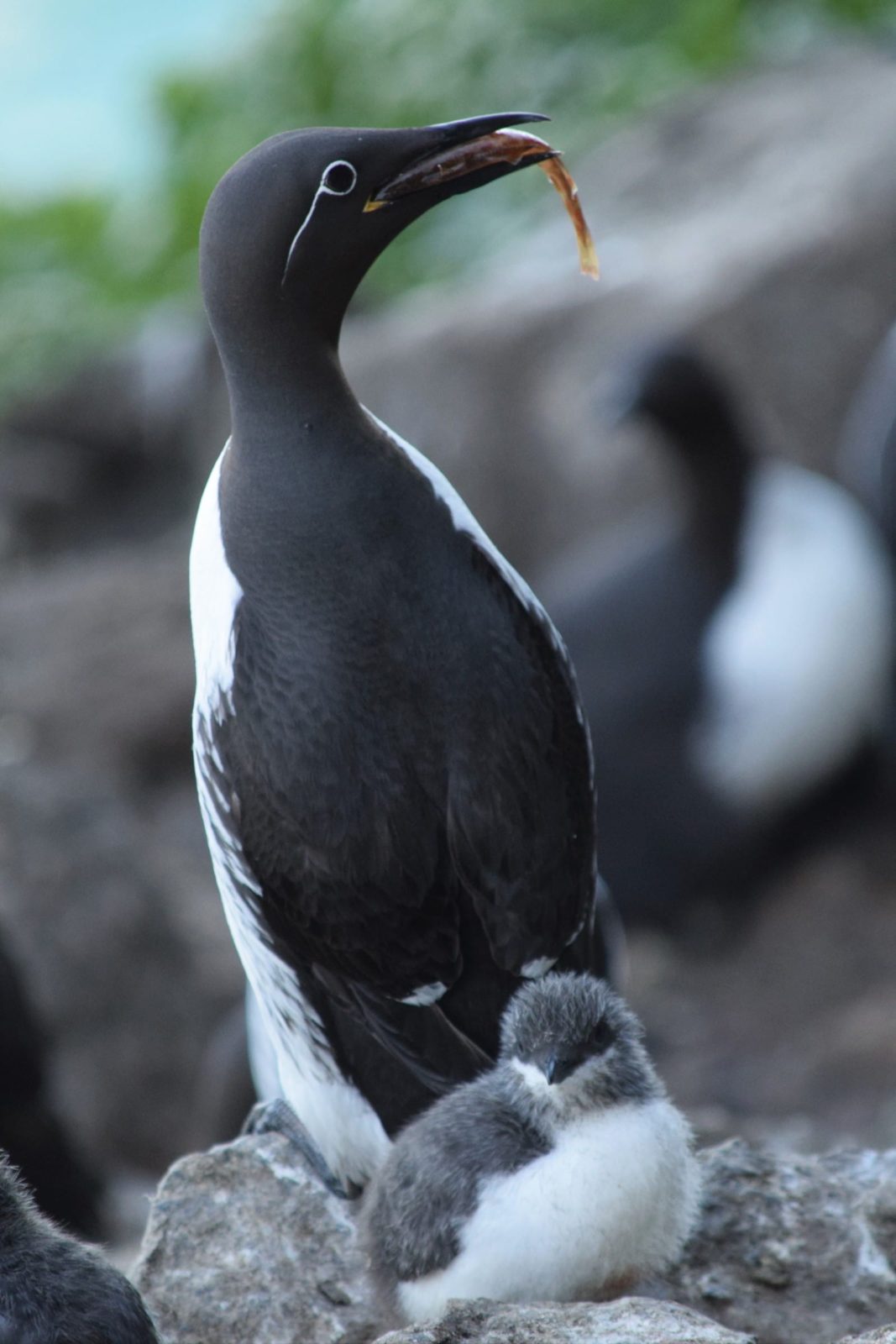 Adult Common Murre/Guillemot with fish and chick (by Beth Clark)