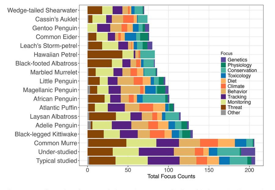 Figure 1 from Pollet, Bond and Lavers (2026): The number of mentions of overstudied seabird species (n = 16) in conference abstracts. Each research focus is represented by a different colour. The under- and typical- studied species are added for comparison (bottom two bars and scaled to match that of the Common Murre).
